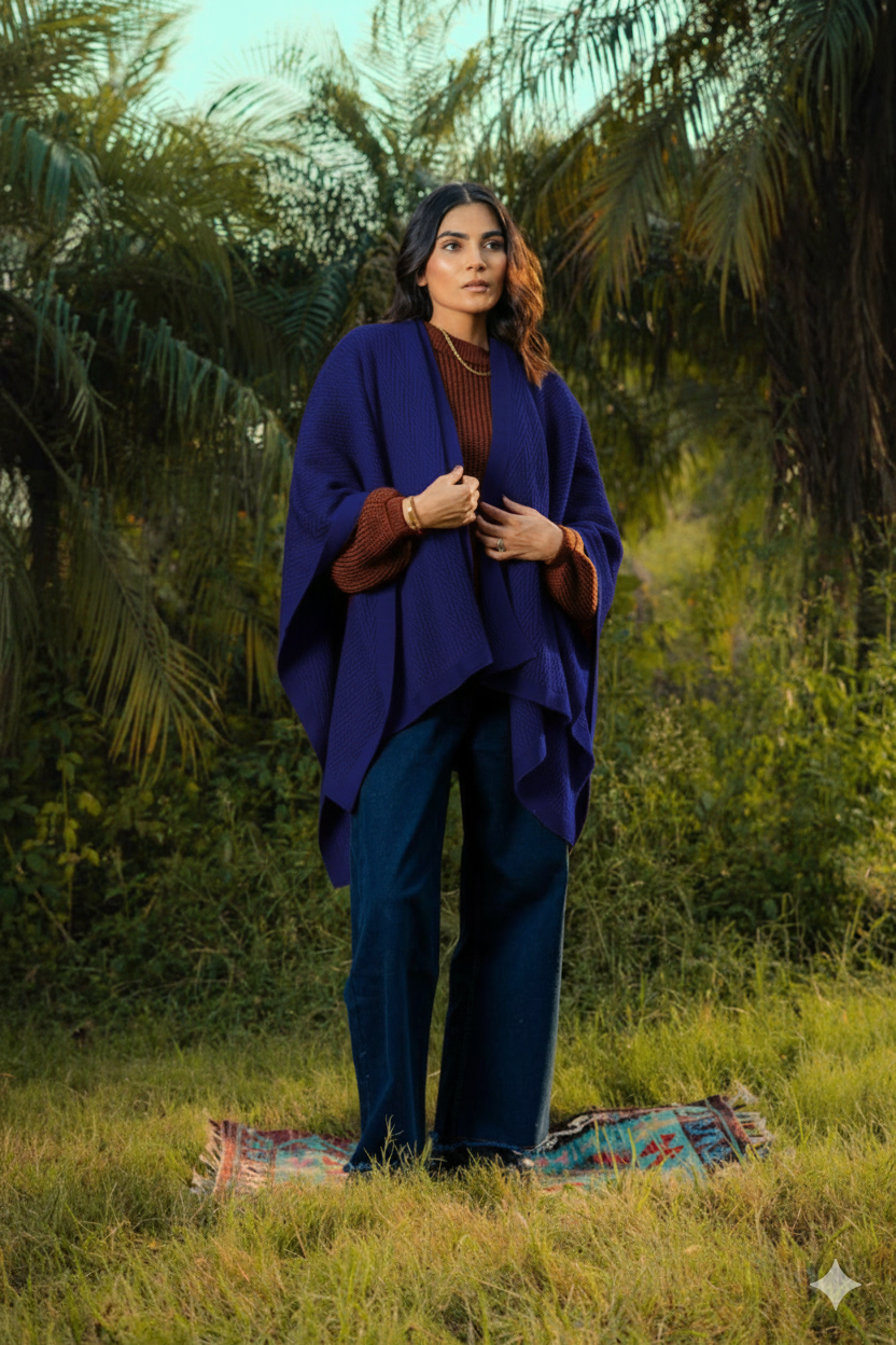 Argyle Knitted Slit Shawl in Lapis Blue