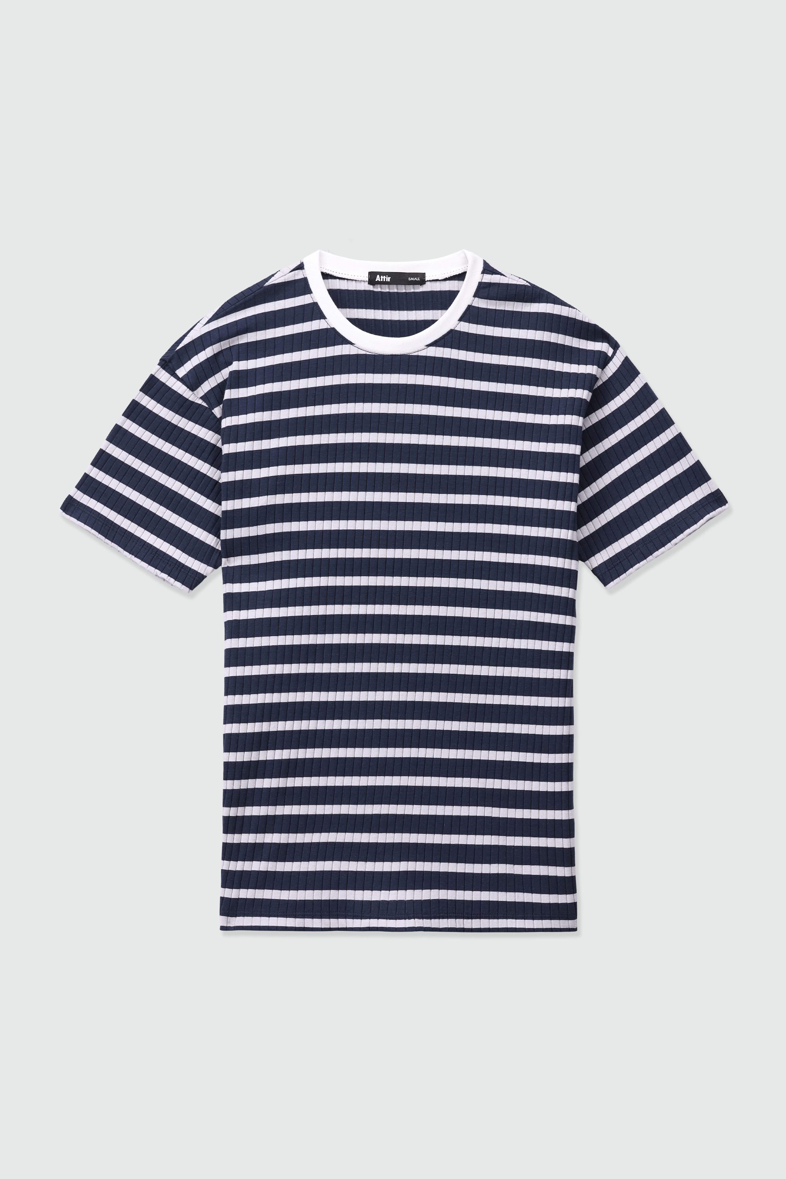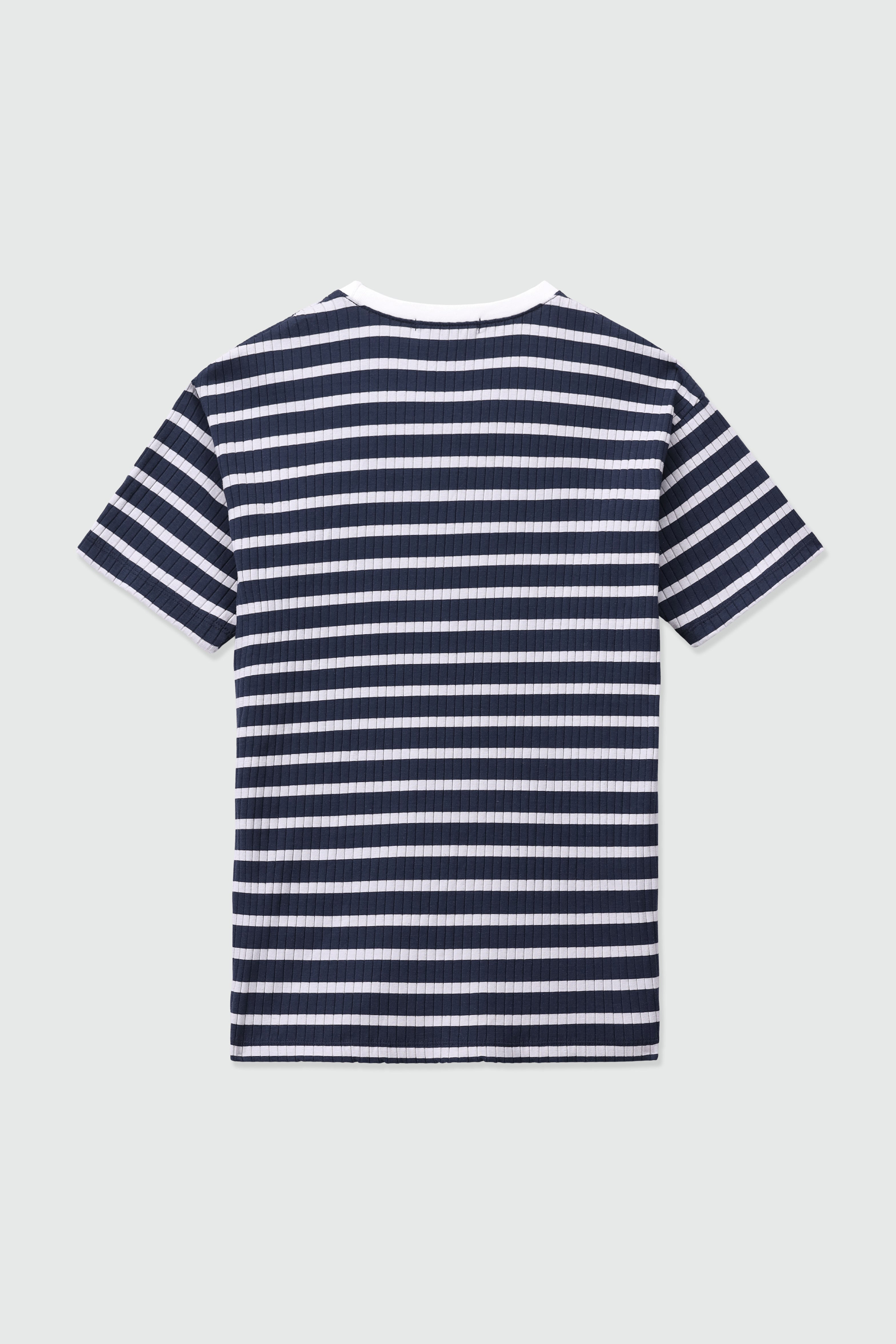 Slip into comfort with this smart crew-neck T-shirt crafted from soft, lightweight yarn-dyed striped fabric. It features contrast trim at the neckline for a subtle accent. With its tapered half sleeves and straight-cut hem.