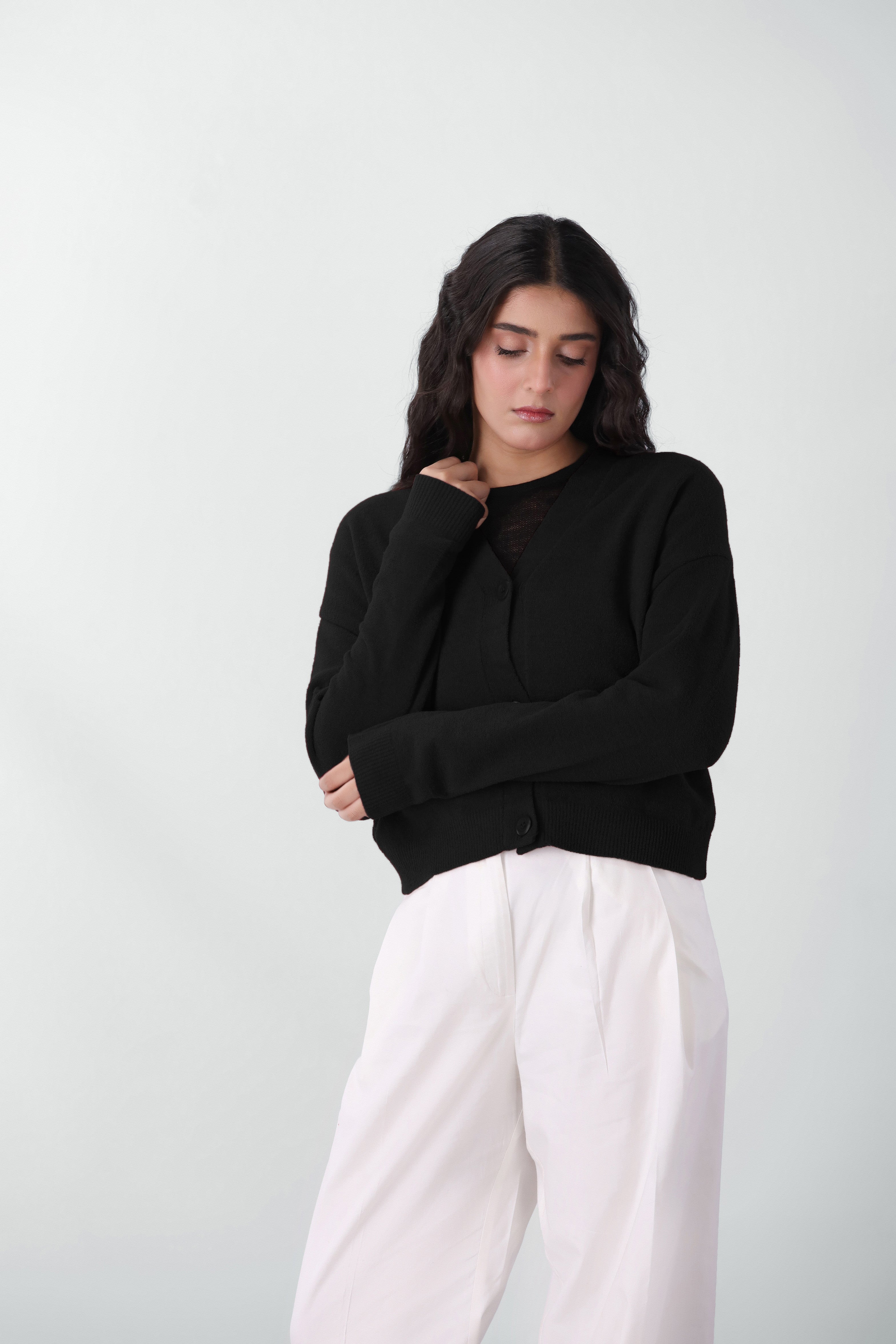 A soft knitted cardigan with a relaxed cropped silhouette, featuring a V-neckline, button-front closure, full-length sleeves, and neatly finished ribbed cuffs and hem for a cozy look.