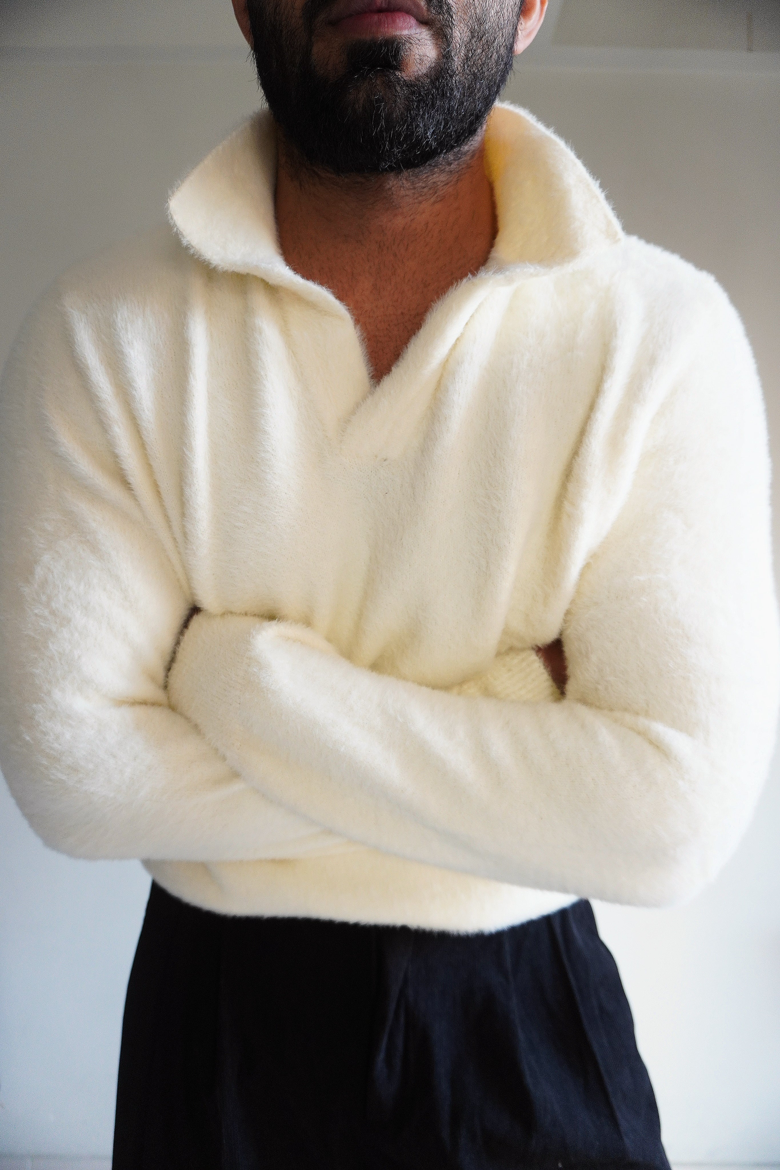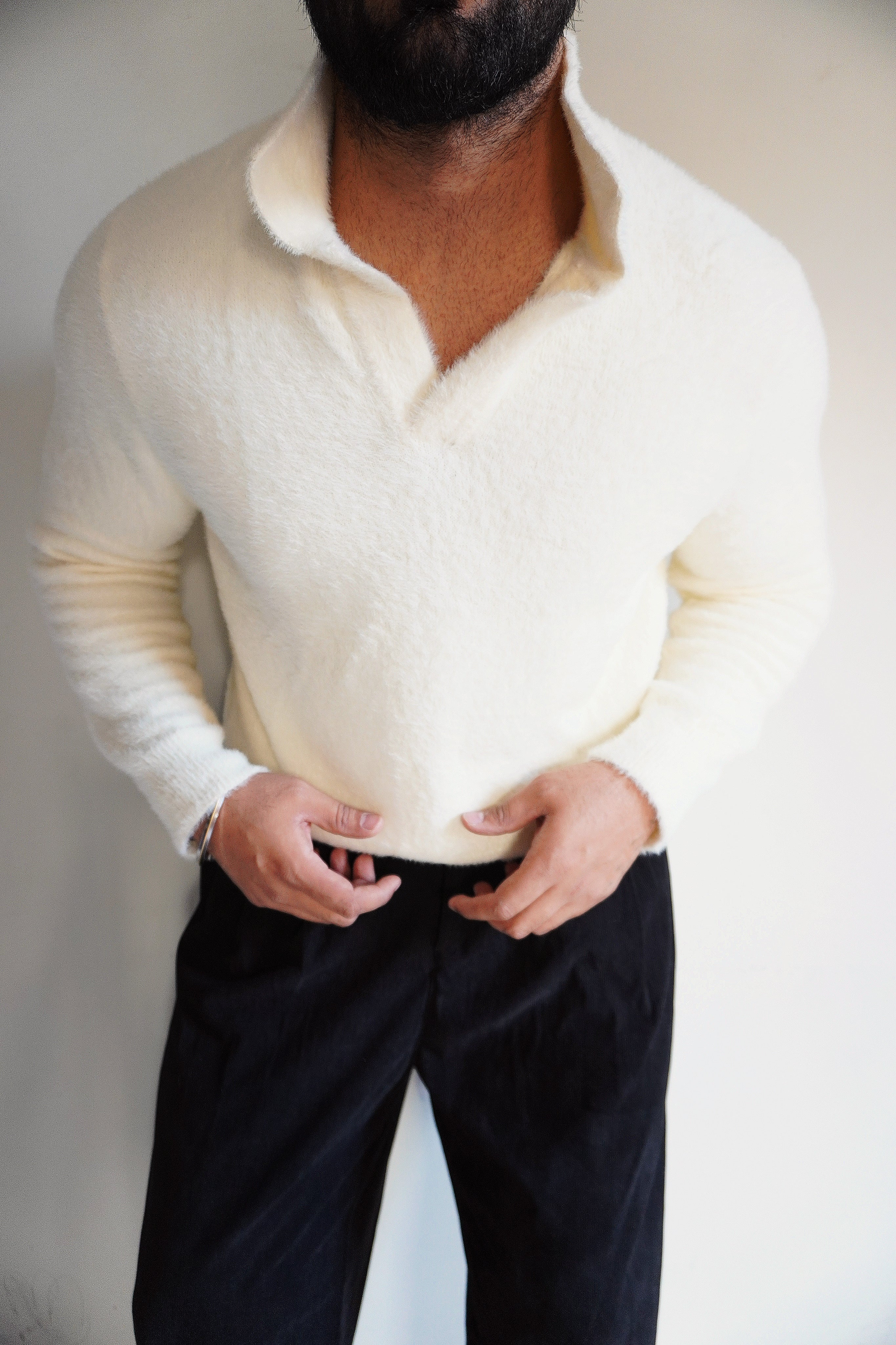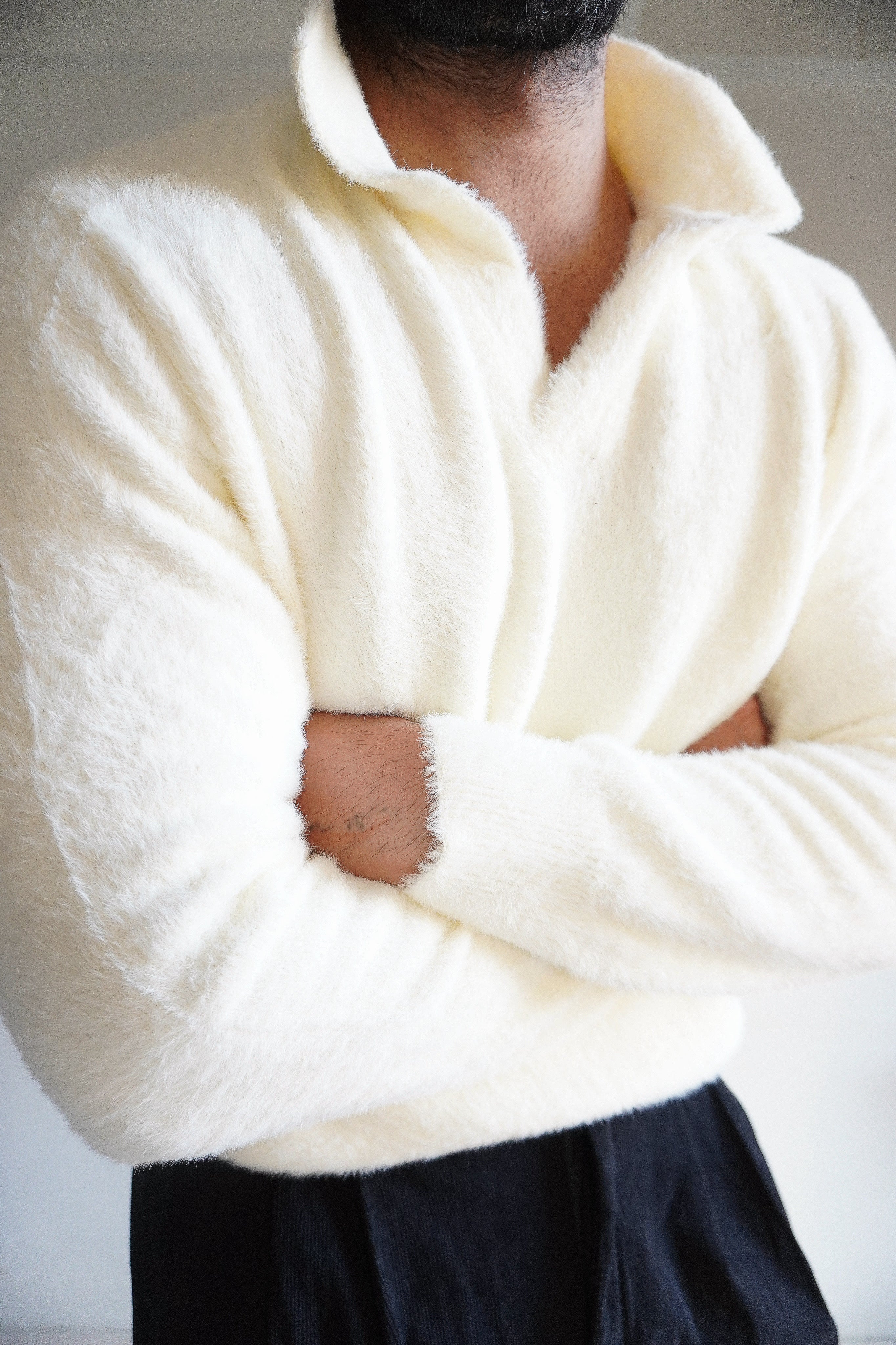 Polo jumper knitted in feather furry yarn offering great stretch. Open revere style collar with a straight-cut hem, V-shaped opening at the front, and long sleeves.