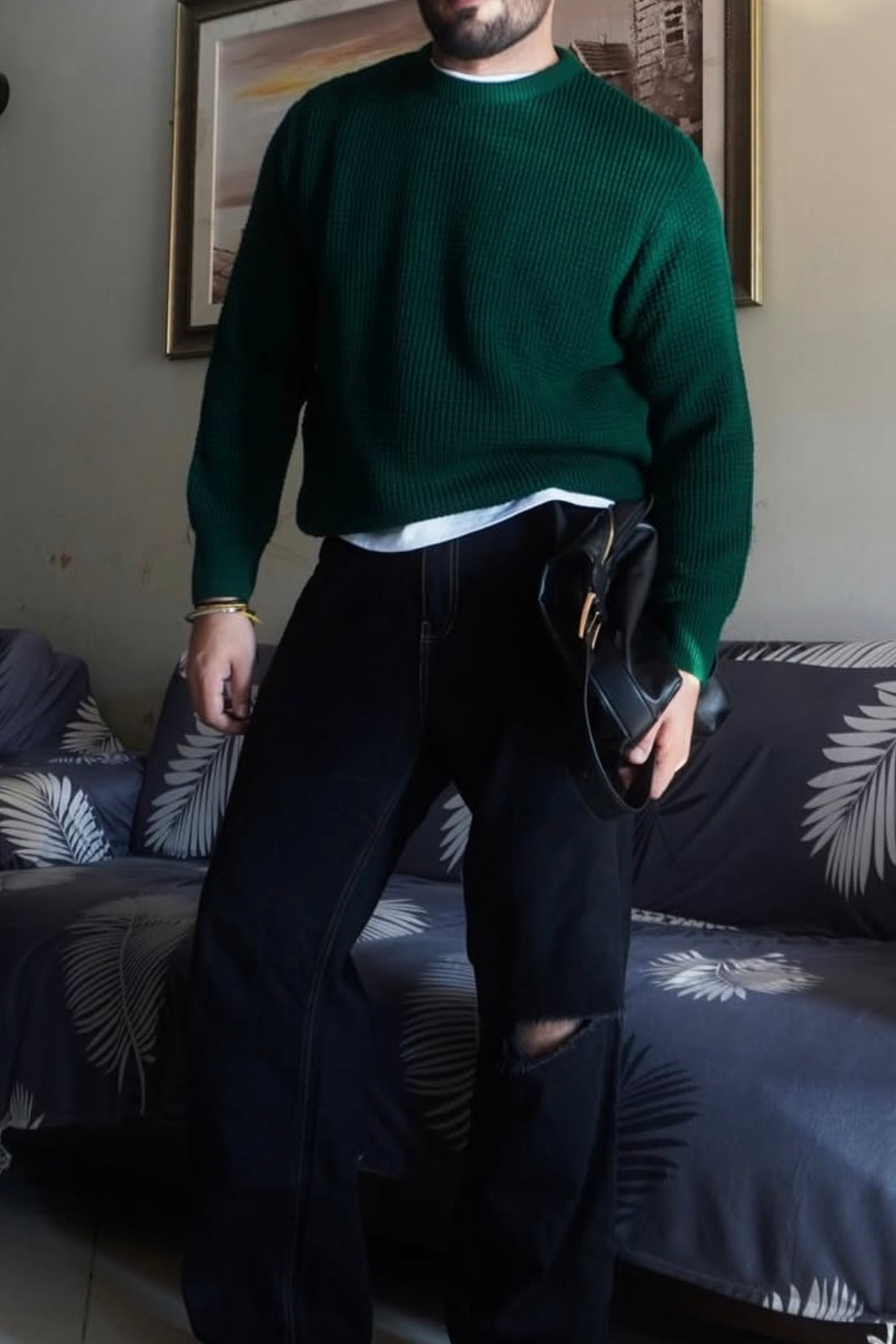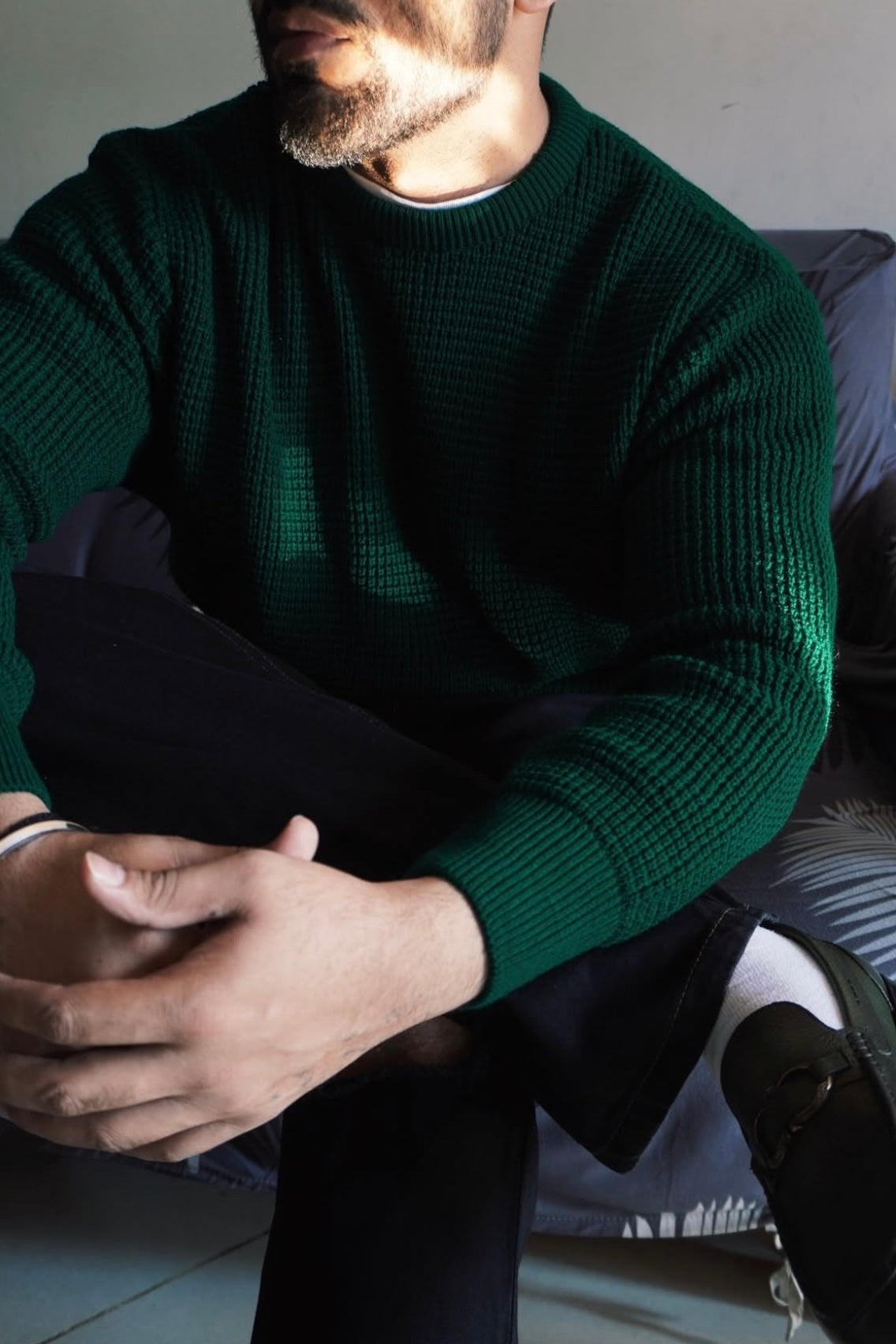 Tuck Knitted Crew Neck Jumper in Bottle Green