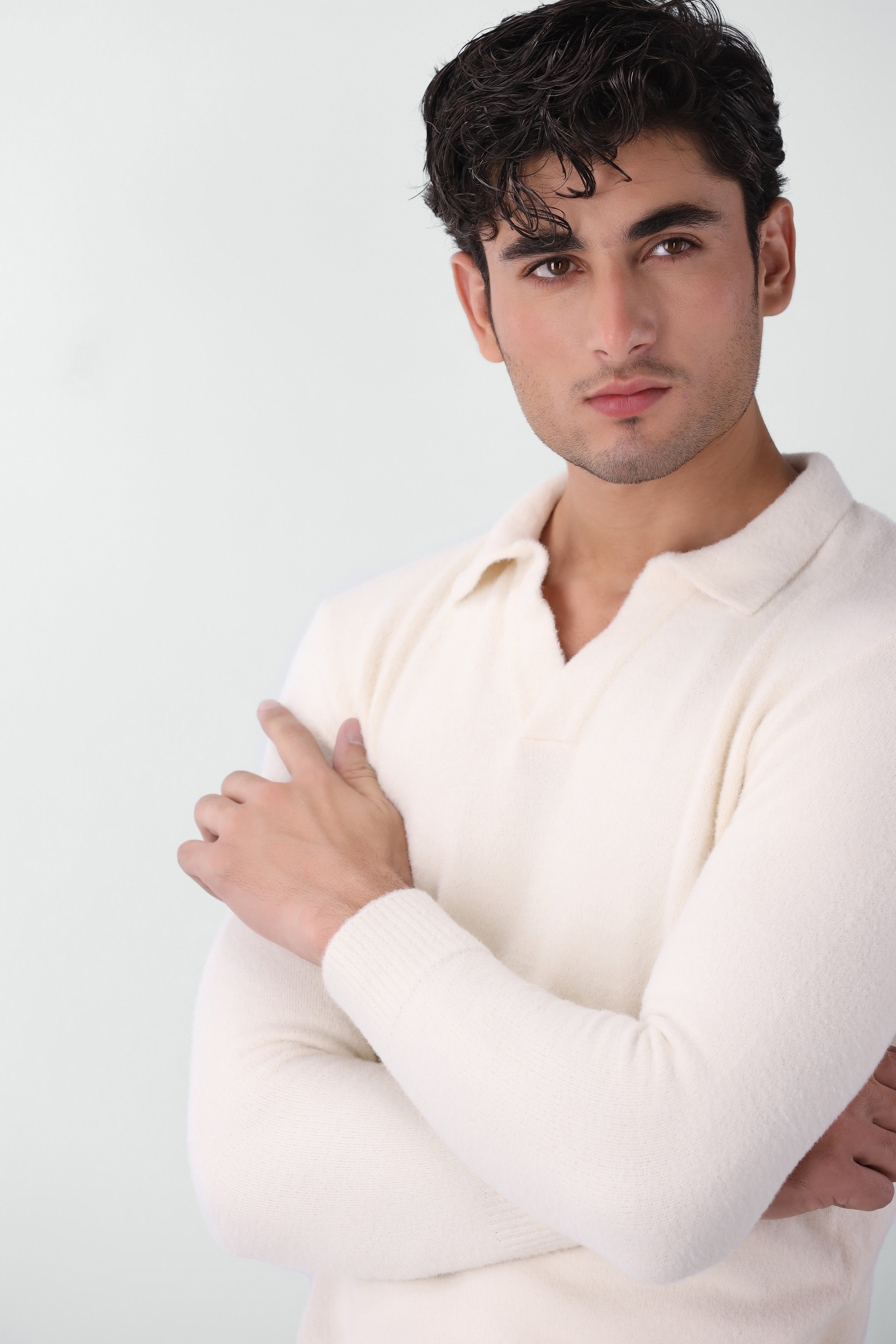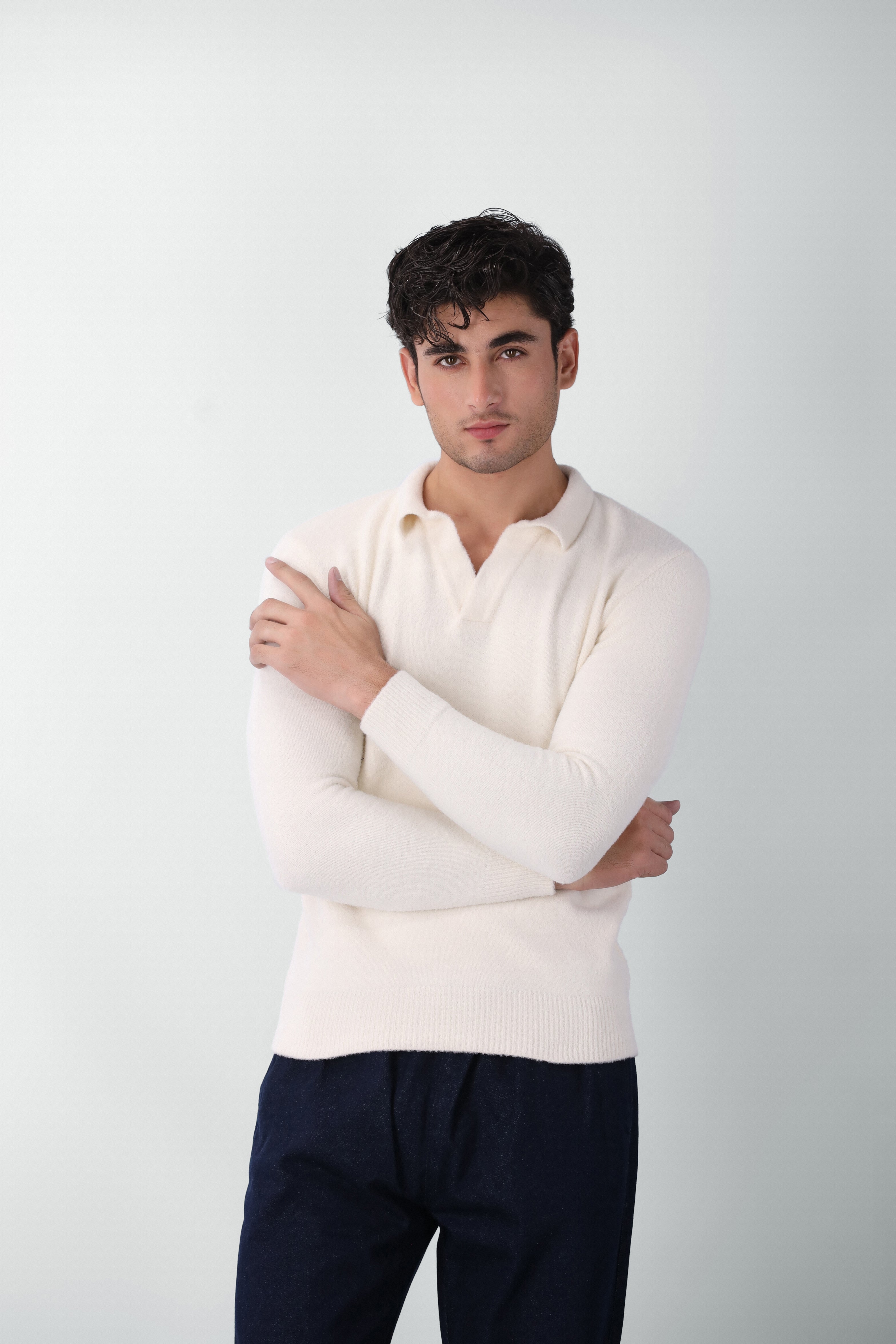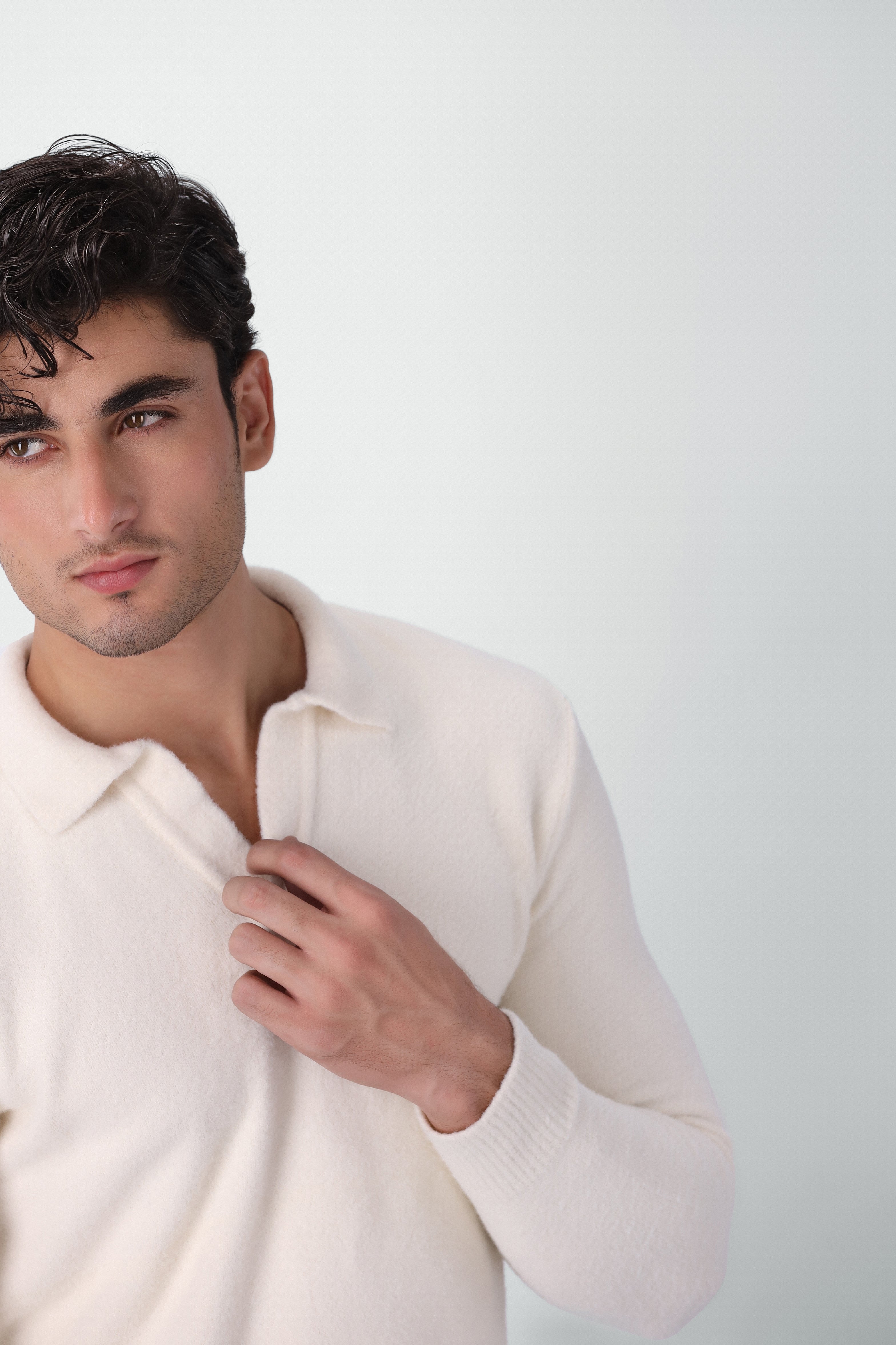 Polo jumper knitted in feather furry yarn offering great stretch. Open revere style collar with a straight-cut hem, V-shaped opening at the front, and long sleeves.
