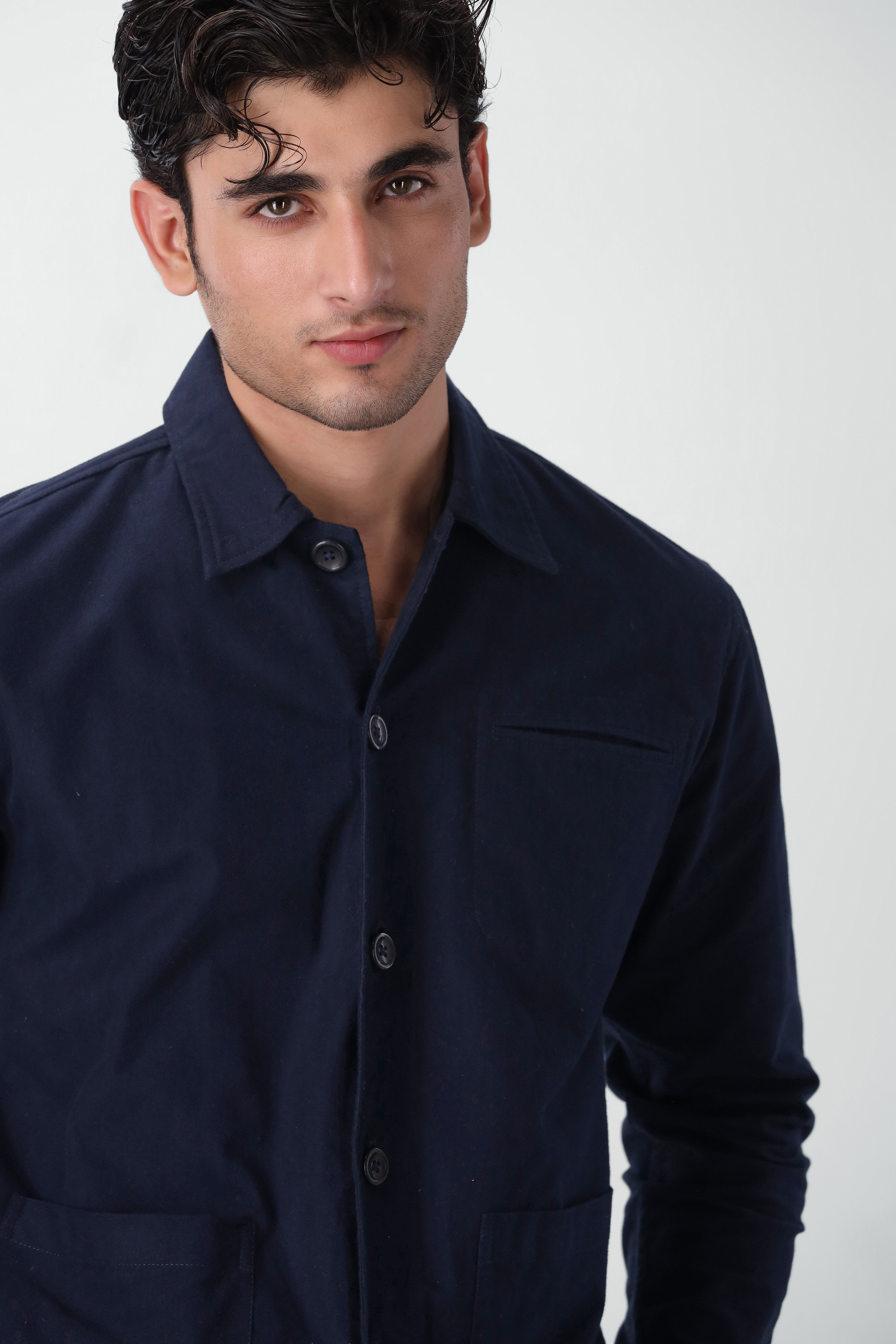 Cotton over-shirt with a spread collar, long sleeves with buttoned cuffs, front button fastening, one welt chest pocket and two large front patch pockets, finished with a rounded hem in deep navy.