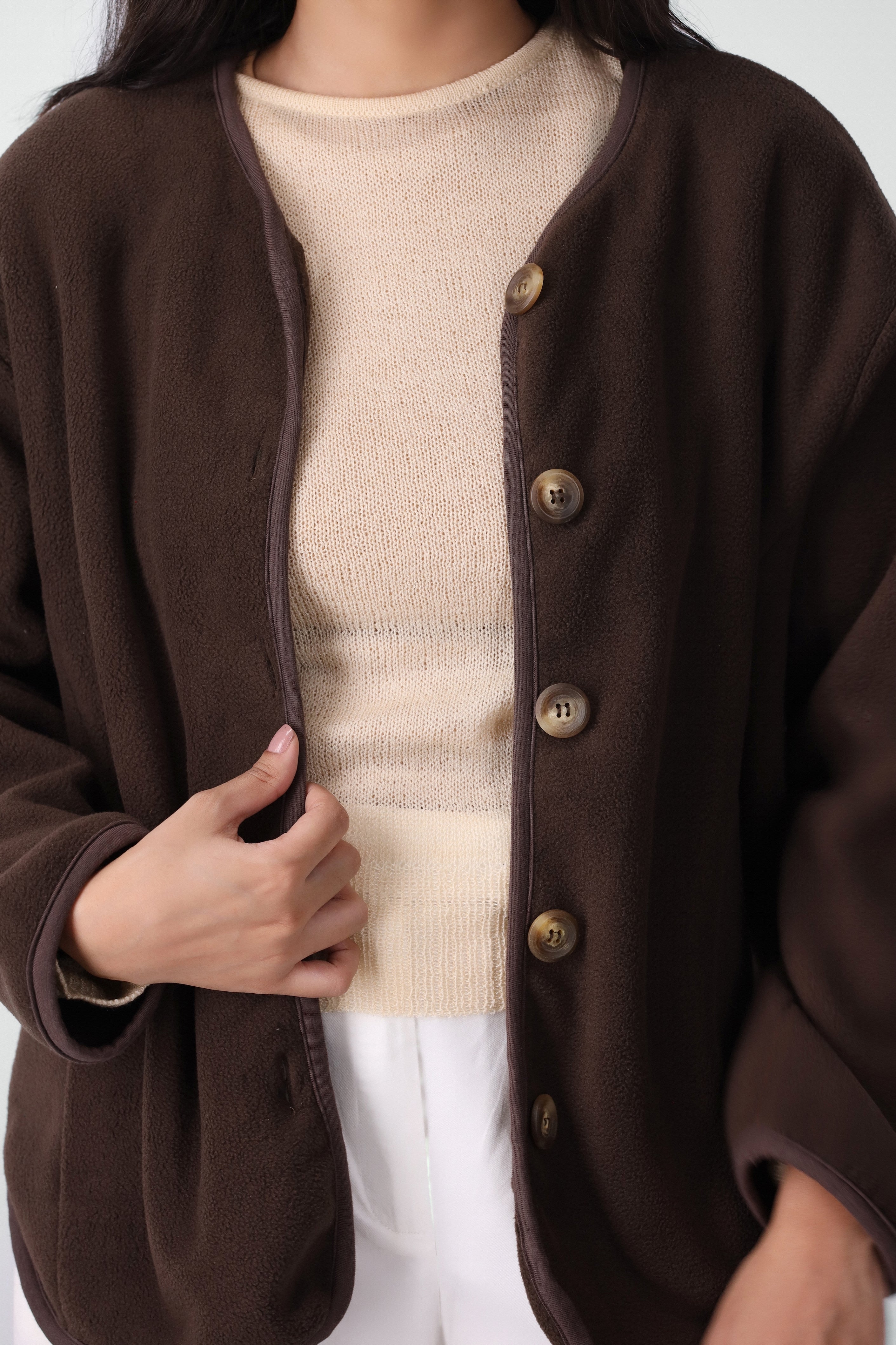 Collarless cardigan made of polar fleece, features dropped shoulders, long sleeves, & curved hem. Functional side pockets at front. Warm, soft & Lightweight. Can be worn as an inner & outer layer.