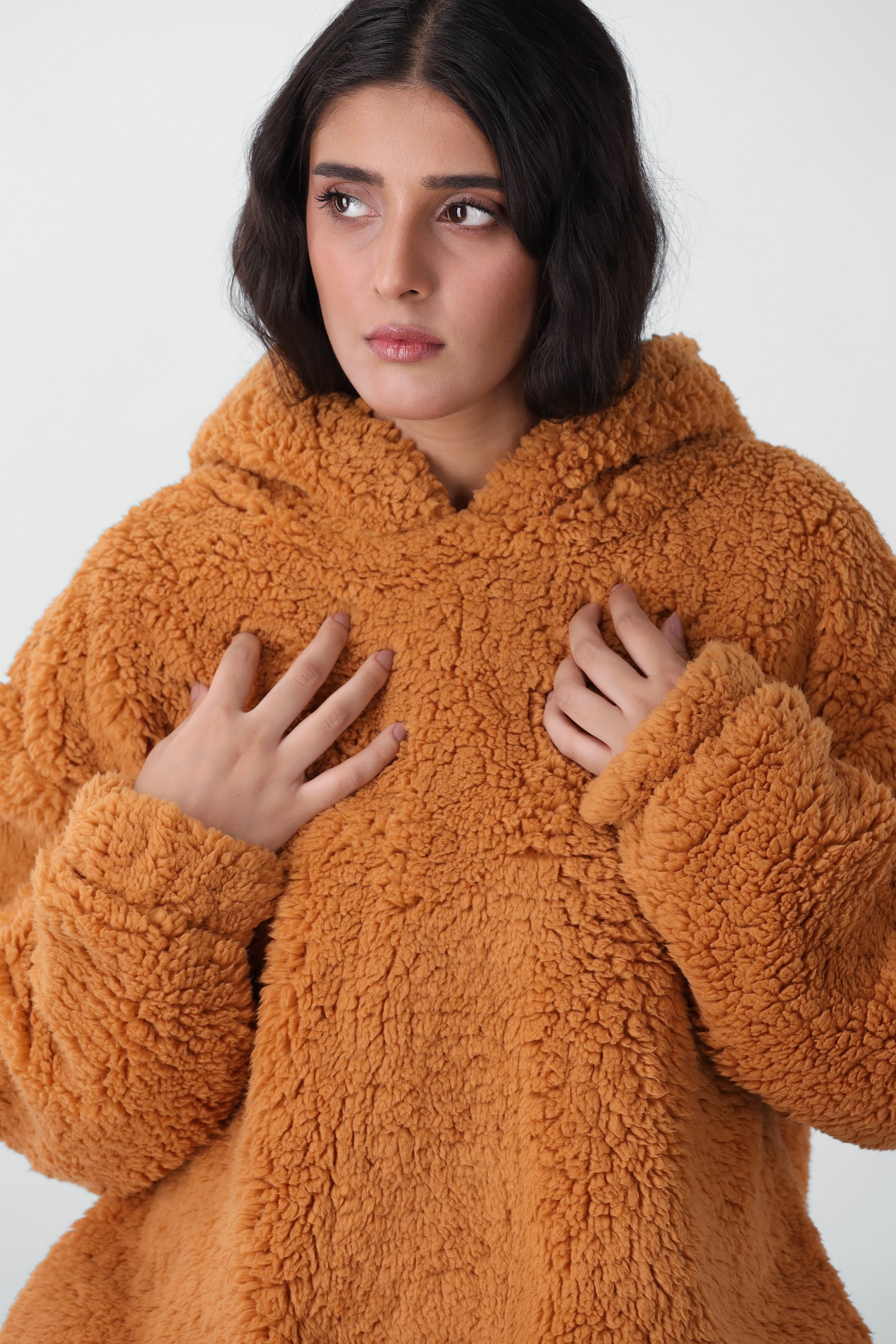 Hoodie in Sherpa fur fleece, heavily dropped shoulders, long sleeves, & elasticated cuffs and bottom. The perfect silhouette for a comfortable and cozy wear. Lined.