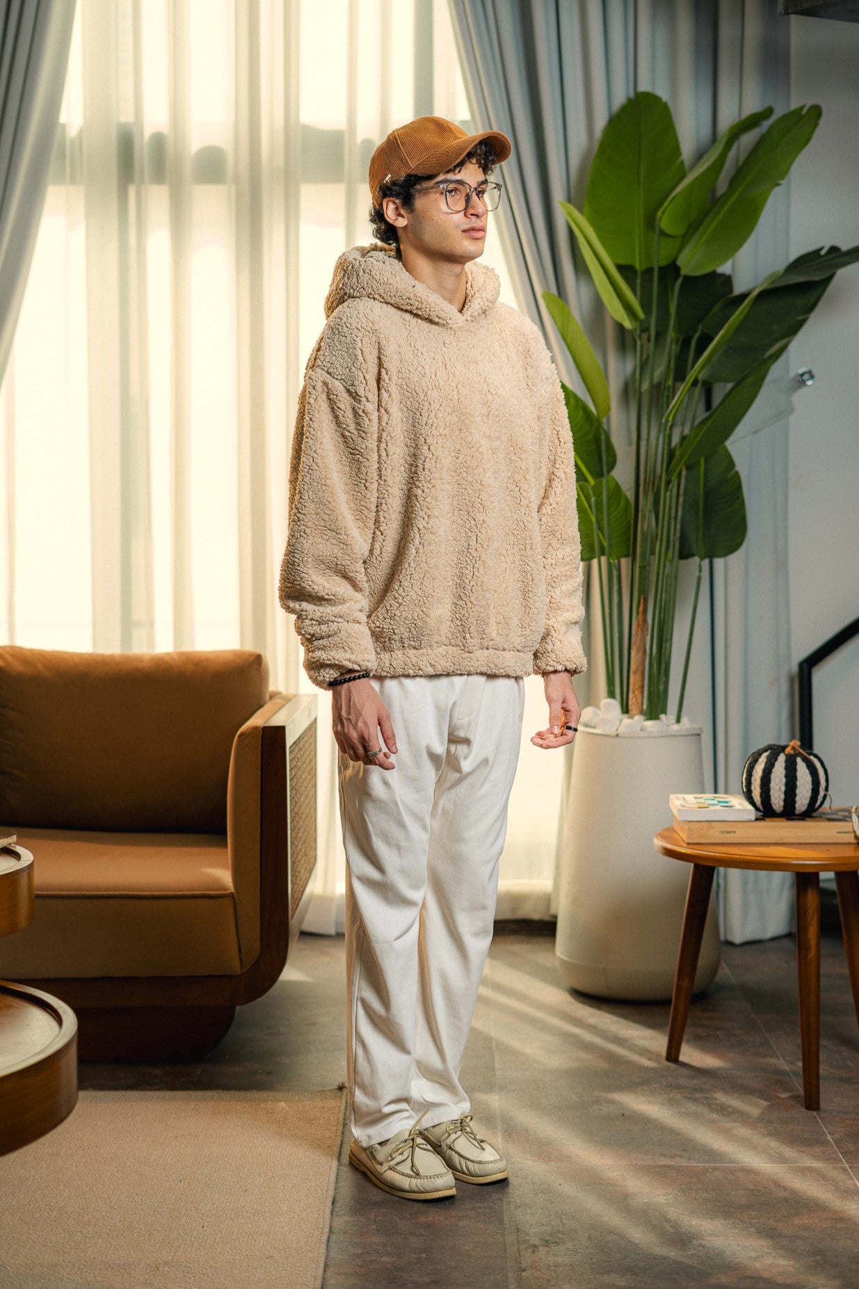 Hoodie in Sherpa fur fleece, heavily dropped shoulders, long sleeves, & elasticated cuffs and bottom. The perfect silhouette for a comfortable and cozy wear. Lined.