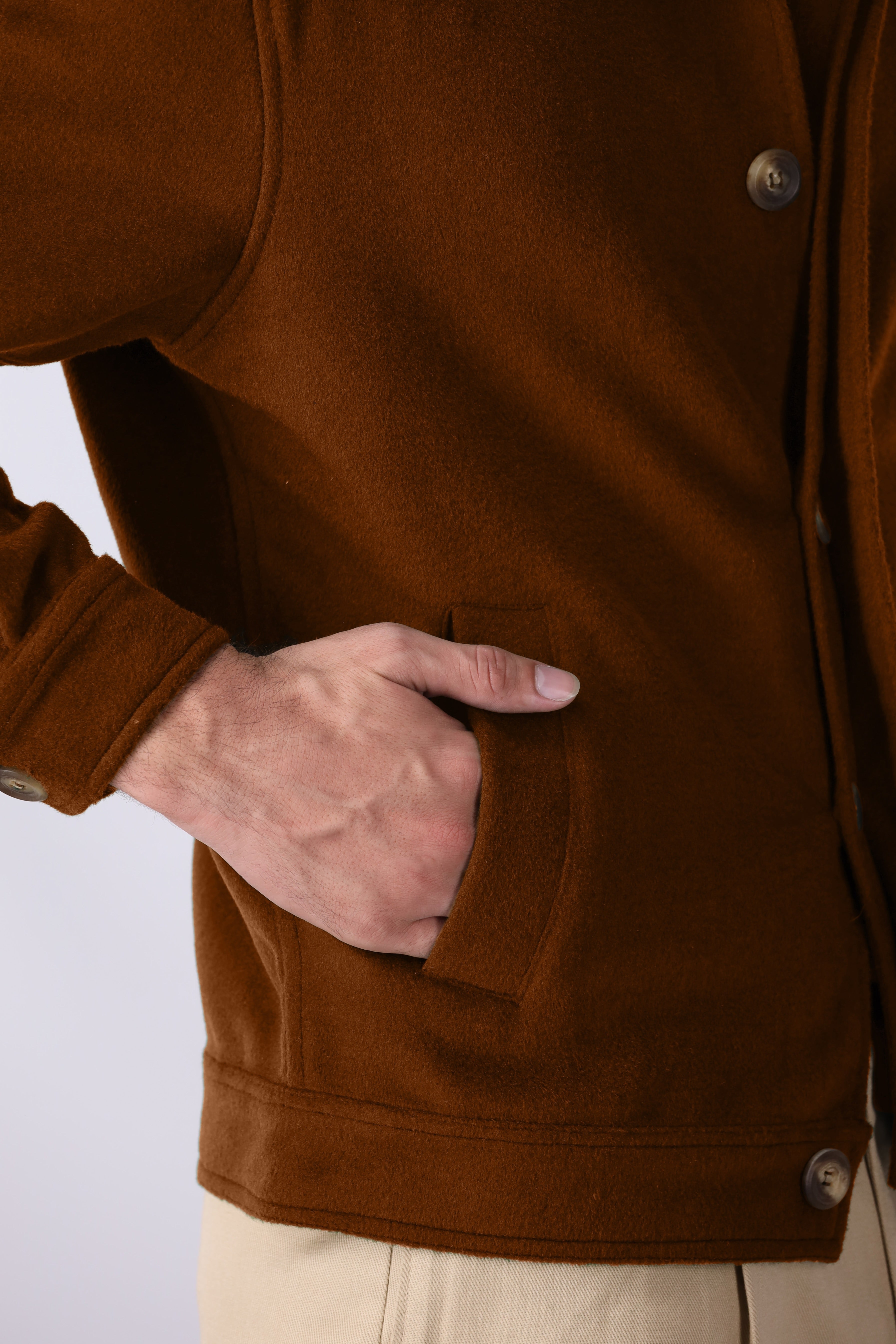 Refined wool-blend jacket with a clean spread collar, concealed button-front closure and sleek side welt pockets—unlined for a crisp, minimalist finish.