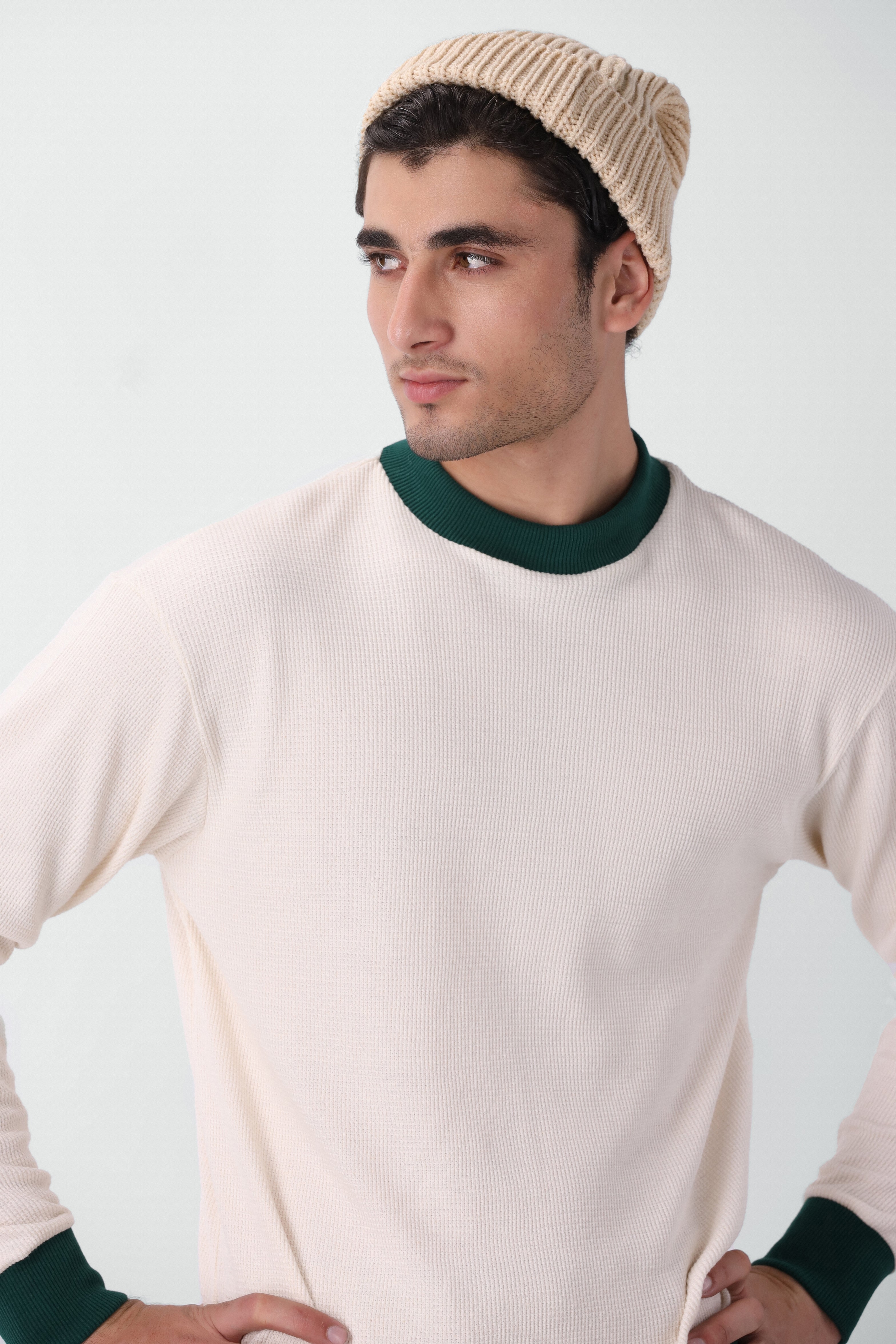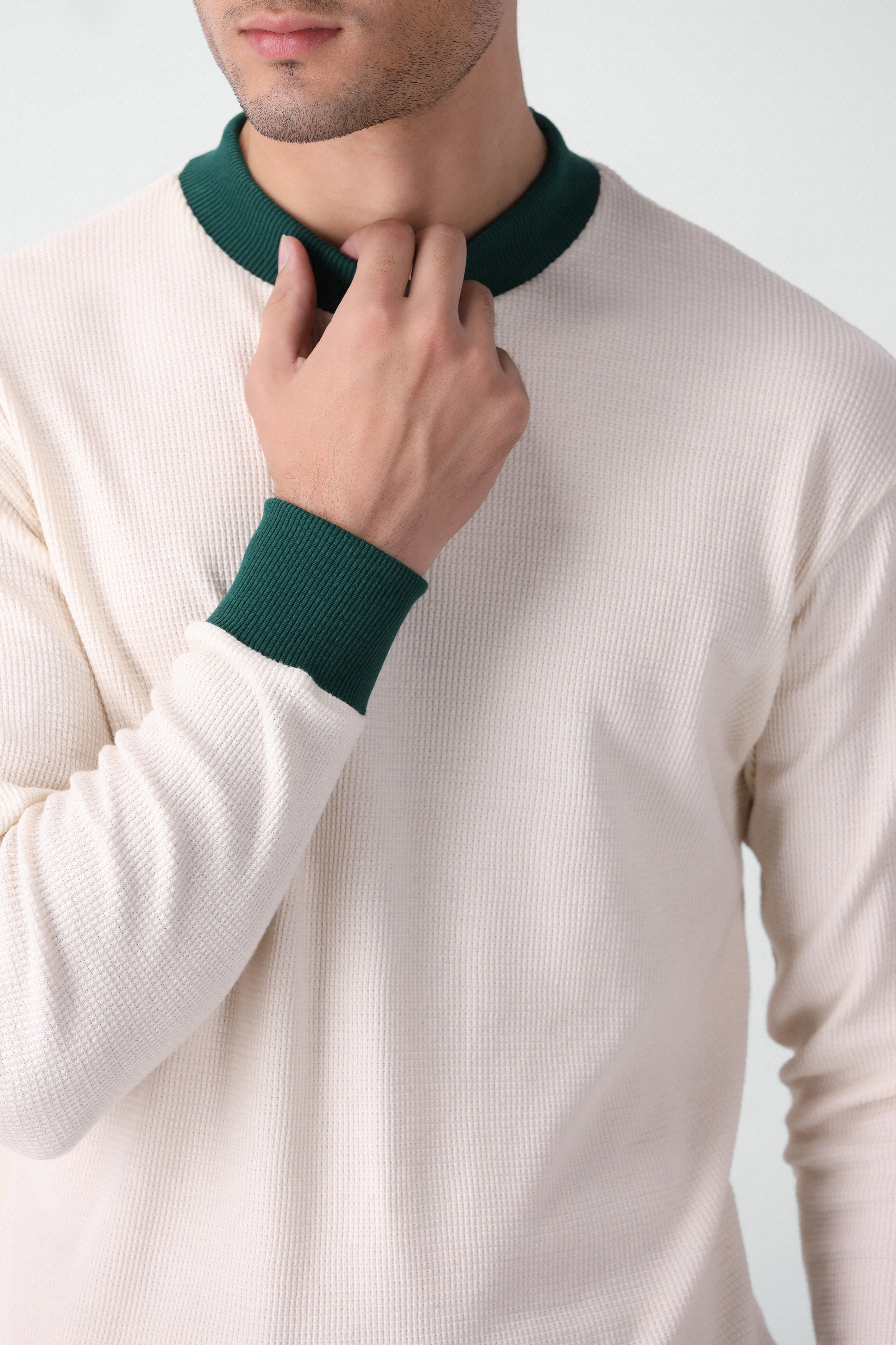 Waffle Textured Contrast Trims Sweatshirt in Green